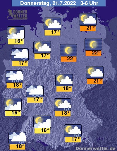 In der bevorstehenden Nacht ist der Himmel über der Nordosthälfte meist locker bewölkt oder sternenklar, dazu bleibt es hier trocken. Im übrigen Land ziehen im Nachtverlauf gebietsweise dichte Wolken hinweg und es können sich sowohl Schauer als auch örtliche Gewitter bilden, dazwischen lockert es jedoch auch auf. Die Temperatur sinkt auf tropische 22 Grad in Berlin und bis 16 Grad in Saarbrücken.