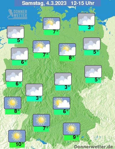 Heute Nachmittag ist es zumeist stark oder dicht bewölkt, dabei fallen allerdings nur selten ein paar Tropfen. Im Süden zeigt sich das Wetter hingegen oft heiter bis sonnig, dabei bleibt es trocken. Die Temperatur liegt bei 3 Grad an der Müritz und bis 10 Grad am Oberrhein.