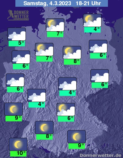 Heute Abend ist der Himmel im Süden, vor allem im Alpenvorland oft sternenklar. Weiter nach Norden hin ist es jedoch überwiegend wolkenverhangen und nur gebietsweise ist es auch mal etwas aufgelockert bewölkt. Es bleibt weitgehend trocken bei 4 Grad in Rostock und bis zu 10 Grad in Freiburg.