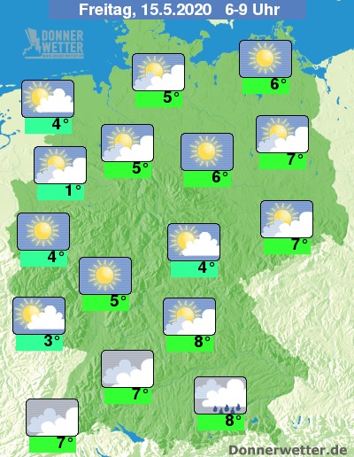 Der Freitag startet über dem Süden Bayerns und Baden-Württembergs mit einer meist geschlossenen Wolkendecke, aus der am Alpenrand auch mal ein paar Tropfen Regen fallen können. In den übrigen Landesteilen ist der Himmel überwiegend teils heiter, teils wechselnd bewölkt und es bleibt trocken.