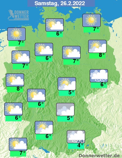 Heute halten sich im Osten und Südosten noch meist dichte Wolken, dazu ist regional noch etwas Regen oder Schnee möglich, zumeist bleibt es aber trocken. Im übrigen Bundesgebiet ist es überwiegend heiter oder sonnig und dazu trocken. Die Temperatur steigt auf 4 Grad in Augsburg und bis 8 Grad in Bonn.