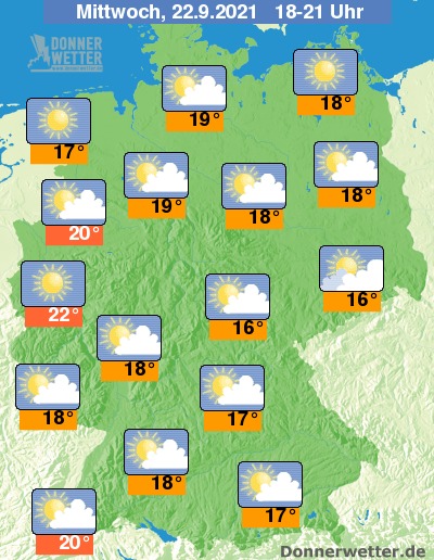 Heute Abend lockert und heitert der Himmel auch über den östlichen Landesteilen immer weiter auf. Im übrigen Bundesgebiet ist es weiterhin verbreitet heiter bis sonnig und nur hin und wieder ziehen auch mal mehr Wolken durch, dabei bleibt es trocken. Die Temperatur liegt bei 16 Grad in Chemnitz und bis zu 22 Grad in Köln.