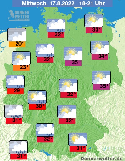 Heute Abend nimmt auch die Bewölkung über der Osthälfte mehr und mehr zu, jedoch bleibt es hier noch weitgehend trocken. Im übrigen Land ist es häufig stark, teils auch aufgelockert bewölkt, dabei bilden sich gebietsweise Schauer, örtlich entwickeln sich auch Gewitter. Die Temperatur liegt bei 20 Grad in Emden und bis zu 35 Grad in Magdeburg.