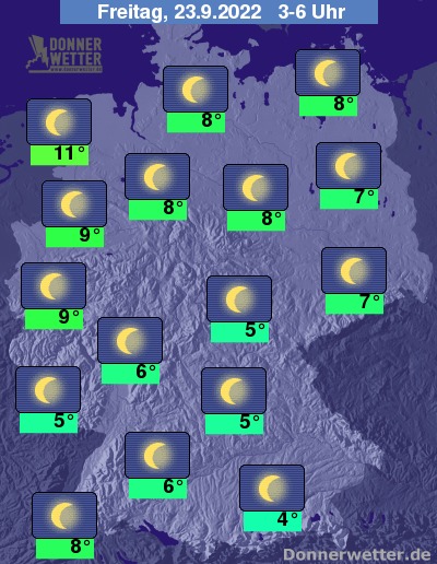 In der folgenden Nacht funkeln über Deutschland verbreitet die Sterne von einem wolkenlosen Himmel. Bei Tiefstwerten von 11 Grad in Cuxhaven und bis 4 Grad in München bleibt es überall trocken.