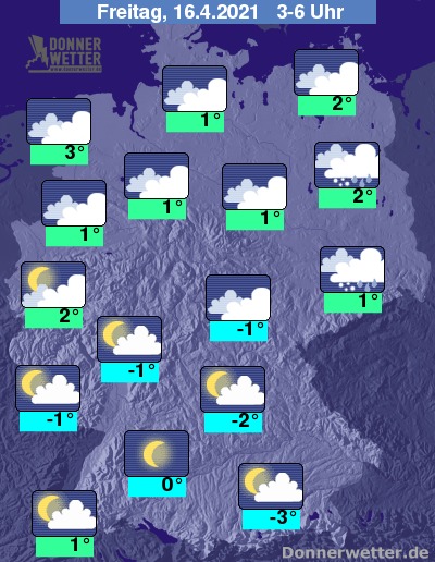 In der kommenden Nacht setzt im Osten bei dichten Wolken zeitweise Regen oder Schneefall ein. Auch im übrigen Osten, Nordosten und Norden bleibt es weitgehend dicht bewölkt, jedoch auch weitgehend trocken. Oft aufgelockert bewölkt ist es im Westen. Im Süden ist es sogar meist nur gering bewölkt oder sternenklar, dazu bleibt es trocken. Die Temperatur sinkt auf 3 Grad an der Nordseeküste und bis -3 Grad in Oberbayern.