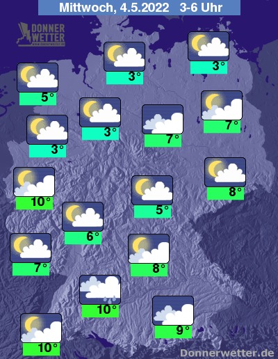 In der Nacht zum Mittwoch ist es im Süden oft dicht bewölkt und es bilden sich vor allem bis Mitternacht noch vielerorts Schauer und selten auch Gewitter, jedoch lockert es hier im Nachtverlauf meist auf und die Niederschläge klingen weitgehend ab. Im übrigen Land ist es verbreitet gering bis aufgelockert, im Osten auch oft stark bewölkt, dazu bleibt es trocken. Die Temperatur sinkt auf 10 Grad in Stuttgart und 3 Grad in Neubrandenburg.