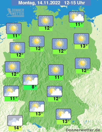 Heute Nachmittag zeigt sich über der Nordhälfte von Deutschland verbreitet die Sonne und es können höchstens lockere Wolken durchziehen. Im Süden ist es zum Teil heiter, gebietsweise bleibt es aber auch trüb oder stark bewölkt, jedoch bleibt es auch trocken. Die Temperatur liegt bei 8 Grad am Westerwald und 14 Grad am Oberrhein.