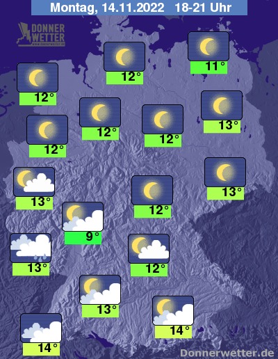 Heute Abend ist der Himmel vor allem über dem Norden und Osten weitgehend sternenklar. Im Südwesten ziehen gebietsweise dichte Wolken auf, die hier Schauer bringen können, sonst ist es über dem Westen und Süden meist locker bis aufgelockert bewölkt und trocken. Die Temperatur liegt bei 9 Grad in Wiesbaden und etwa 14 Grad in München.