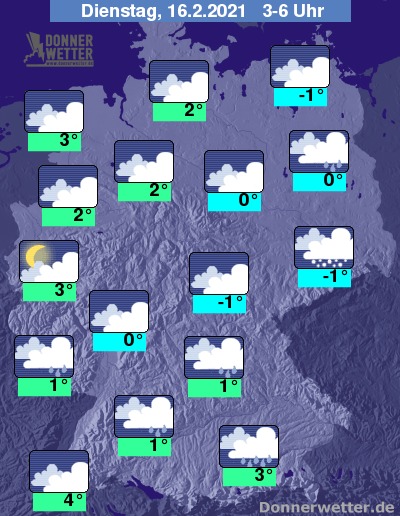 In der kommenden Nacht ist es weitgehend bedeckt, häufig ist es neblig-trüb, dazu fällt im Süden und Osten gebietsweise, sonst nur vereinzelt Regen. Im Osten und Südosten ist anfangs auch noch Schnee, Schneeregen und gefrierender Regen möglich, dabei besteht erhöhte Glättegefahr! Die Temperatur sinkt auf 4 Grad in Freiburg und bis -1 Grad in Neubrandenburg.