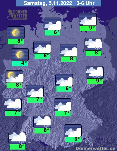 In der Nacht zum Samstag fällt über dem Südwesten und Osten bei dichten Wolken gebietsweise Regen. Vom Niederrhein bis zur Nordsee klart der Himmel verbreitet auf. Im übrigen Land hält sich meist dichte Bewölkung, es bleibt jedoch trocken. Die Temperatur sinkt auf 9 Grad in der Lausitz und bis 4 Grad im südlichen Emsland.