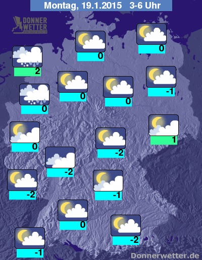 In der Nacht zum Montag ist es auch im Süden und Osten, wie bereits im großen Rest des Landes aufgelockert bewölkt und es bleibt trocken. Im äußeren Norden und Nordwesten ziehen jedoch dichte Wolken durch und es fällt gebietswweise etwas Regen, Schneeregen oder Schnee. Die Temperatur sinkt auf 2 Grad an der Nordsee und bis -2 Grad in München.