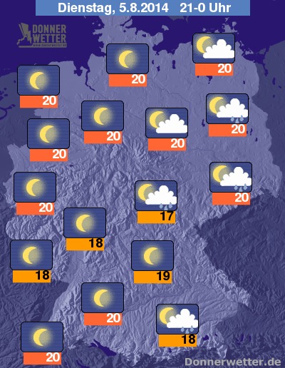 Heute Abend können sich im Osten und Südosten bei teils dichten Wolken noch einzelne Schauer und Gewitter bilden, sonst zeigt sich aber ein vielfach sternenklarer Himmel und es bleibt dazu trocken. Dabei werden in der Nordhälfte noch verbreitet Abendtemperaturen um 20 Grad gemessen, mit 17 Grad ist es am Thüringer Schiefergebirge nur etwas frischer.