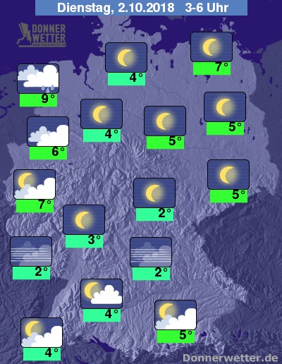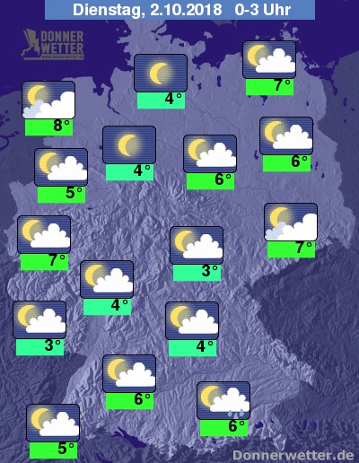 In der Nacht zeigt sich der Himmel zunächst über weiten Landesteilen locker bewölkt und es bleibt trocken. Im Alpenvorland können auch einzelne Schauer fallen.