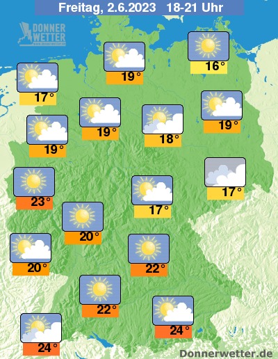 Heute Abend scheint verbreitet die Sonne und es ziehen verbreitet nur noch lockere Wolkenfelder durch oder es ist wolkenlos. Mehr Wolken halten sich noch über Teilen von Sachsen, aber auch hier bleibt es trocken. Die Temperatur liegt bei 16 Grad in Rostock und bis 24 Grad in München.