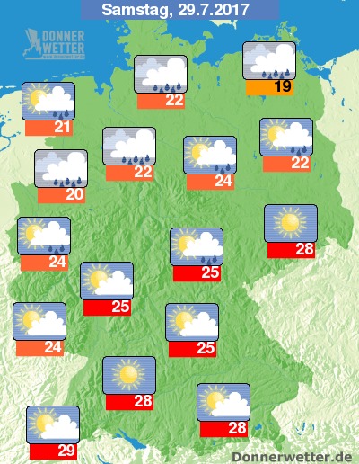 Am Samstag ziehen über die Nordhälfte Deutschlands oft dichte Wolken hinweg, die hier wiederholt für Regen oder einzelne Schauer sorgen, dazwischen kann sich die Sonne ebenfalls blicken lassen. Deutlich freundlicher mit viel Sonnenschein zeigt sich das Wetter hingegen im Süden, hier bleibt es trocken. Die Temperatur steigt auf 19 Grad in Rostock und bis 29 Grad in Freiburg.