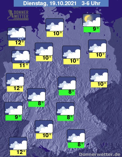 In der Nacht zum Dienstag ist es über dem Süden und Osten noch anfangs aufgelockert, sonst ist jedoch schon meist stark oder dicht bewölkt. Im Verlauf zieht es sich auch im Süden und Osten immer weiter zu. Es bleibt zunächst trocken. Nach Mitternacht setzt jedoch vom Niederrhein bis zum Mittelrhein Regen ein, sonst bleibt es noch weitgehend trocken. Die Temperatur sinkt auf 12 Grad in Köln und bis 8 Grad in München.