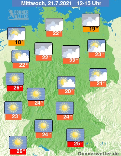 Heute Nachmittag ist es im Süden und zum Großteil auch im Westen sonnig. Im übrigen Land ist es meist heiter bis wechselnd bewölkt, im Norden aber auch gebietsweise bedeckt, hier sind einzelne Schauer möglich, während es sonst trocken bleibt. Die Temperatur liegt bei 18 Grad an der Nordsee und bis 26 Grad entlang des Rheins.