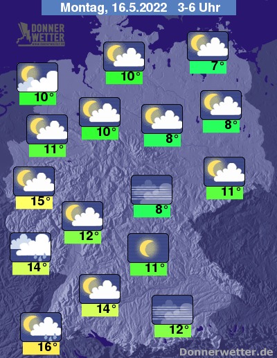 In der folgenden Nacht zeigt sich der Himmel überwiegend gering bis locker bewölkt, zum Morgen hin ist es auch zunehmend wechselnd bewölkt. Im Südwesten sind anfangs schon oft dichte Wolken unterwegs, die im Nachtverlauf weiter zunehmen, hier bilden sich in der zweiten Nachthälfte gebietsweise Schauer, sonst bleibt es aber trocken. Die Temperatur sinkt auf 16 Grad in Freiburg und 7 Grad in Neubrandenburg.