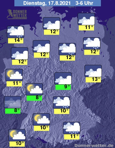 In der kommenden Nacht fällt im Südosten des Landes noch zeitweise Regen, der erst gegen Morgen abklingt, sonst lockert und klart der Himmel über der Südwesthälfte des Landes verbreitet auf und es bleibt trocken. Über der Nordosthälfte bleibt es dagegen stark bewölkt, Auflockerungen sind jedoch möglich, allerdings können sich wiederholt Schauer und selten auch Gewitter bilden. Die Temperatur sinkt auf 14 Grad an der Nordsee und bis 8 Grad im Saargau.