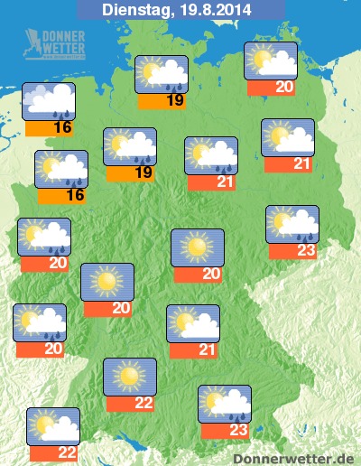Der Dienstag wird besonders in der Nordwesthälfte des Landes häufig unbeständig und nass, es können sich hier immer wieder Schauer und auch einzelne Gewitter bilden. Seltener, aber dennoch möglich sind auch Schauer und vereinzelte Gewitter im Süden und Osten des Landes, hier scheint zwischendrin jedoch auch häufiger die Sonne. Die Temperatur steigt auf für August sehr kühle 16 Grad an der Ems und auf spätsommerliche 23 Grad am Inn.