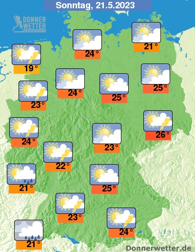 Am Sonntag ist es oft heiter bis sonnig, im Tagesverlauf ziehen aber nicht selten auch einige Quellwolken auf, dabei besteht ein meist leichtes, an der Nordsee und an den Alpen mäßiges Schauer- und Gewitterrisiko. Sonst bleibt es weitgehend trocken bei Höchstwerten von 19 Grad in Wilhelmshaven und bis 26 Grad in Dresden.