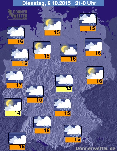 In der Nacht zum Mittwoch bleibt es über Deutschland bei einer überwiegend starken oder dichten Bewölkung, Auflockerungen sind am ehesten im Nordwesten und Westen möglich. Vor allem über Süddeutschland fällt verbreitet starker und langanhaltender Regen, sonst fällt in einem breiten Streifen zwischen Schleswig-Holstein bis nach Thüringen hinein zeitweise Regen. In den übrigen Landesteilen bleibt es zumeist trocken. Die Temperatur sinkt auf 15 Grad an der Nordsee und bis 12 Grad am Bodensee.