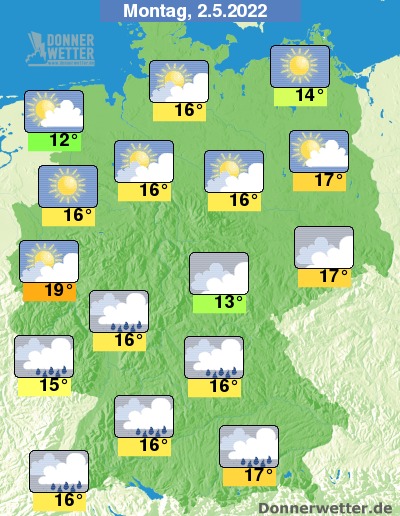 Am Montag ist es über der Nordhälfte des Landes gering bis wechselnd bewölkt und trocken. Weiter nach Süden hin ziehen dagegen häufig dichte Wolken durch und es bilden sich vielerorts Schauer, örtlich sind auch Gewitter möglich. Die Temperatur steigt auf 12 Grad an der Nordsee und bis 19 Grad in der Kölner Bucht.