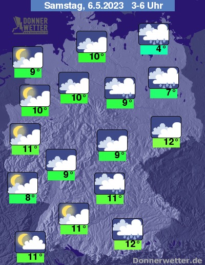 In der kommenden Nacht verlagert sich der Regen in den Nordosten und den äußeren Südosten Deutschlands. Im übrigen Land bleibt der Himmel aber auch meist stark, teilweise auch mal aufgelockert bewölkt, dazu bleibt es weitgehend trocken. Die Temperatur sinkt auf 12 Grad in München und bis 4 Grad in Neubrandenburg.