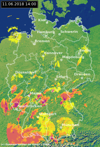 Kräftige Regengebiete bewegen sich aktuell vor allem über weite Teile von Rheinland-Pfalz, Baden-Württemberg und den Norden Bayerns hinweg. Örtlich besteht hier Unwettergefahr.