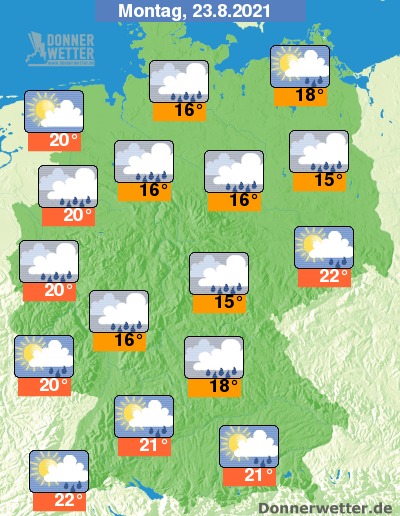 Am Montag ist es über der Nordhälfte Deutschlands überwiegend stark bewölkt, hier und da sind Auflockerungen möglich, jedoch bilden sich zeitweise Schauer, lokal sind auch Gewitter möglich. Im übrigen Land ist es teils dicht, teils locker bewölkt, dabei bilden sich einzelne Schauer, vereinzelt sind zudem Gewitter möglich. Die Temperatur steigt auf teils nur 15 Grad im Eichsfeld und bis 22 Grad im Breisgau.