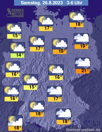 In der Nacht auf Samstag lockern die Wolken in der West- und Nordwesthälfte zunehmend auf und die Schauer klingen, ausgenommen das Nordseeküstenumfeld, weitgehend ab. In den übrigen Landesteilen bleibt der Himmel wechselnd oder stark bewölkt, dabei muss mit teils kräftigen Schauern und Gewittern gerechnet werden.