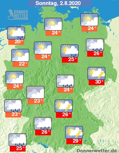 Am Sonntag ist das Wetter im Süden und Osten meist stark bewölkt und hier bilden sich wiederholt Schauer und mögliche Gewitter. Im übrigen Land ist es oft stark, teils aufgelockert bewölkt, dabei sind nur einzelne Schauer möglich. Die Temperatur erreicht teils 20 Grad an der Nordseeküste und bis zu 30 Grad in Dresden.