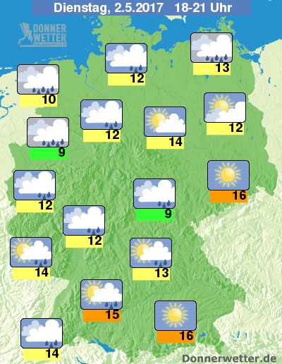 Heute Abend bleibt es meist bei dem sehr durchwachsenen Wetter mit dichten Wolken und wiederholten Regenfällen. Deutlich freundlicher und trocken zeigt sich im Abendverlauf jedoch der Himmel über Bayern und Sachsen, hier kommt die Sonne richtig zum Zuge. Die Temperatur liegt bei 9 Grad im Münsterland und bei bis zu 16 Grad in der Lausitz.