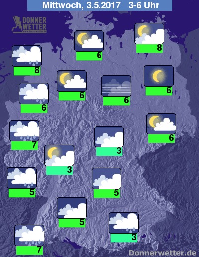 In der Nacht zum Mittwoch ist der Himmel über dem Osten und Norden überwiegend locker oder aufgelockert bewölkt, zum Teil sogar sternenklar, dazu bleibt es trocken. Dichte Wolken halten sich hingegen über dem Alpenvorland und in den westlichen Landesteilen entlang des Rheins, hier fällt zeitweise Regen. Im übrigen Land ist es meist stark bewölkt, aber trocken. Die Temperatur sinkt auf 8 Grad in Rostock und bis 3 Grad in Rosenheim.