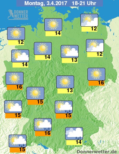 Heute Abend bilden sich im Süden bei oft dichter Bewölkung einzelne Schauer, selten auch Gewitter. Weiter nach Norden hin herrscht dagegen verbreitet heiteres bis sonnig und dazu trockenes Wetter. Die Temperatur liegt bei frühlingshaften 12 bis 16 Grad.