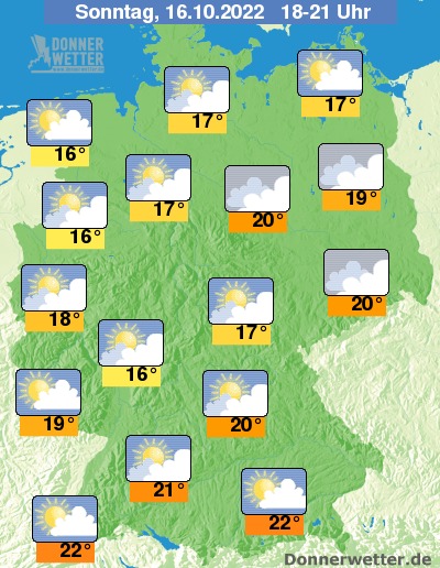 Heute Abend ist es über dem Bundesgebiet häufig wechselnd oder aufgelockert bewölkt. Dichte Wolken halten sich noch vor allem über dem Osten. Es bleibt trocken bei 16 Grad in Münster und 22 Grad in München.