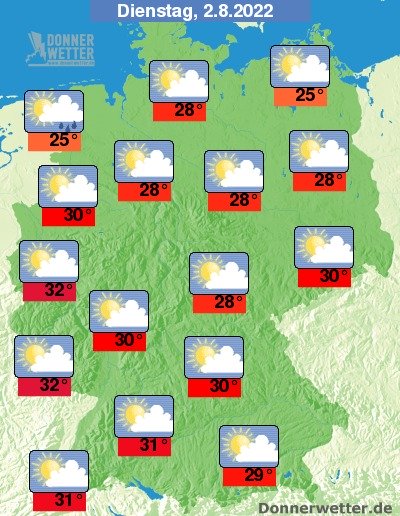 Am Dienstag ziehen gebietsweise viele und zum Teil dichte Wolken durch, sonst ist es aber oft heiter und teils auch sonnig, dabei bleibt es weitgehend trocken. Die Temperatur steigt auf 25 Grad an der See und bis 32 Grad entlang des Rheins.