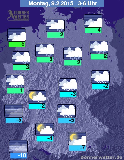 In der Nacht zum Montag ist es in der Südhälfte des Landes bei meist aufgelockerter oder auch nur leichter Bewölkung zunächst trocken. Von Norden her ziehen jedoch dichte Wolken auf, dazu fällt zeitweise Regen, Schneeregen oder Schnee. Nach Mitternacht ziehen die dichten Wolken mit Schneefällen auch in den Süden der Republik. Es muss verbreitet mit Straßenglätte gerechnet werden! Die Tiefstwerte liegen bei 5 Grad in Oldenburg und bis -10 Grad am Schwarzwaldrand.