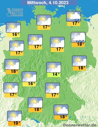 Heute Abend erreicht die Schauerfront auch den Süden und Osten der Republik, seltene Gewitter sind dabei nicht ausgeschlossen. Auch im übrigen Land ist es häufig stark bewölkt, dazwischen kann es aber auch auflockern. Es bilden sich zeitweise Schauer. Die Temperatur liegt bei 16 Grad in Emden und bis zu 30 Grad in Dresden.
