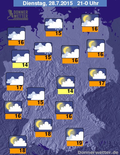 Heute Abend ist es in Süddeutschland locker oder aufgelockert bewölkt und trocken. Besonders im Norden und Westen ziehen jedoch dichte Wolken durch, die auch etwas Regen bringen können. In den übrigen Landesteilen ist es zumeist aufgelockert bewölkt und trocken. Die Abendtemperatur liegt bei 19 Grad in München und etwa 14 Grad am Rande des Harzes.