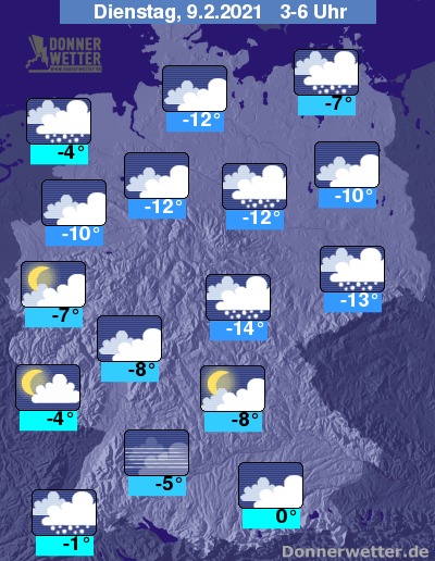 In der kommenden Nacht fällt zunächst noch verbreitet Schnee, vor allem über der Osthälfte fällt zum Teil auch längeranhaltend Schnee. Im Nachtverlauf klingen die Schneefälle im Süden und Westen meist ab und es können sich hier Auflockerungen zeigen. Die Temperatur sinkt auf 0 Grad in München und bis -14 Grad in Jena.