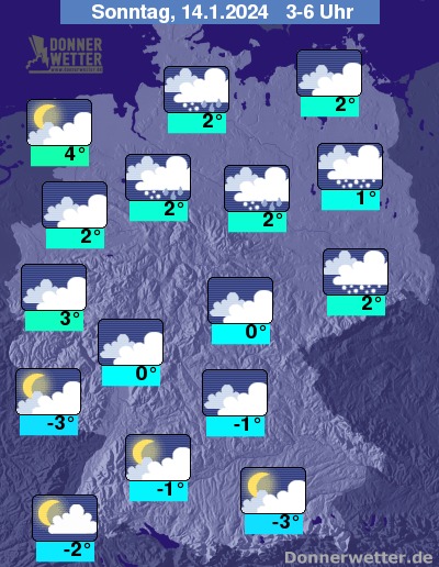 Die Temperaturen erreichen am Nachmittag Höchstwerte um 1 bis 6 Grad, in der Nacht auf Sonntag auf Werte um 4 Grad im Emsland und -3 Grad am Alpenrand zurückgehend.