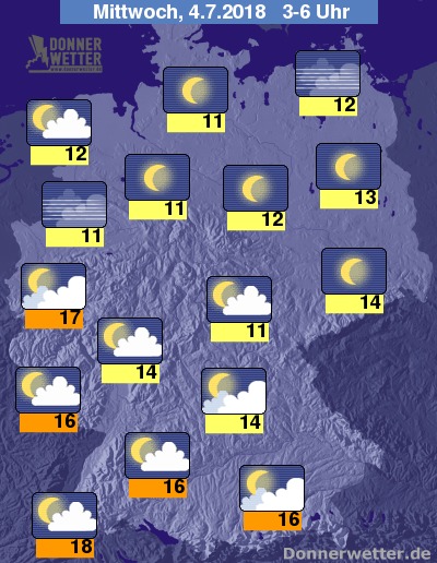 In der Nacht zum Mittwoch ziehen über die Südhälfte oft einige und zum Teil auch dichte Wolken hinweg, einzelne Schauer oder Gewitter sind dabei noch am Alpenrand möglich. Über der Nordhälfte zeigt sich der Himmel dagegen sternenklar, dazu bleibt es trocken. Die Temperatur sinkt auf 18 Grad im Breisgau und bi 11 Grad in der Norddeutschen Tiefebene.