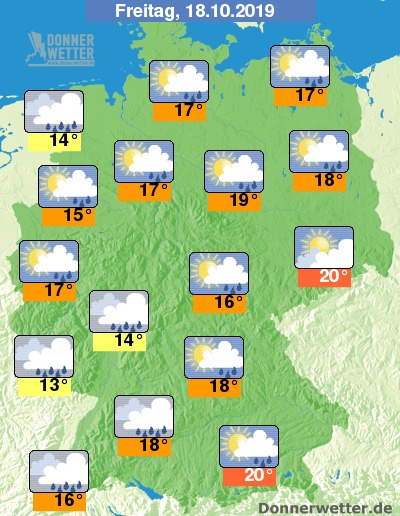 Der Freitag sieht auf den ersten Blick sehr nass aus, doch hinten den Quellwolken, zeigt sich im Tagesverlauf zeitweise die Sonne. Im Südwesten gibt es eher weniger Chancen die Sonne zu sehen.  Um das Erzgebirge besteht so gut wie kein Schauerrisiko, sonst muss man meist mit Schauern oder leichtem Regen rechnen. Die Temperaturen erreichen 20 Grad in Oberbayern und 17 Grad in Bremen.