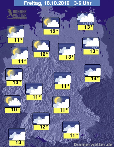 In der kommenden Nacht ist es im Westen meist locker oder aufgelockert bewölkt. Sonst dominiert meist eine dichte Wolkendecke den Himmel, es bleibt aber meist trocken. Schauer sind nur im Norden um die Ostseeküste und Brandenburg zu erwarten. Die Temperaturen erreichen 11 Grad in Ostfriesland und 13 Grad im Schwarzwald.