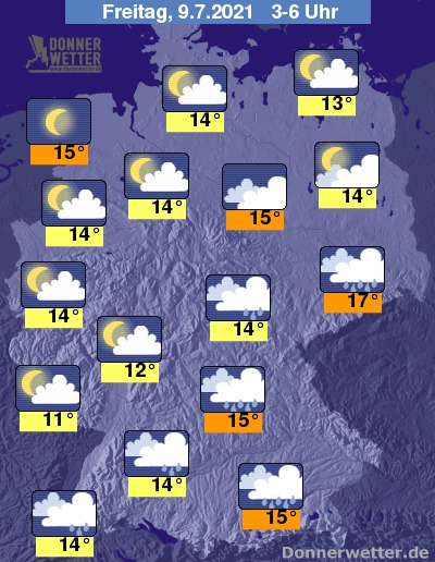 In der Nacht zum Freitag bringen dichte Wolken im Süden und Osten Deutschlands verbreitet Regen. Weiter nach Nordwesten hin ist es zunächst meist stark, im Norden und Westen selbst dann zum Großteil locker bis aufgelockert bewölkt. An der Nordsee ist es oft sternenklar, dazu bleibt es trocken. Die Temperatur sinkt auf 17 Grad in Dresden und bis 11 Grad in Saarbrücken.