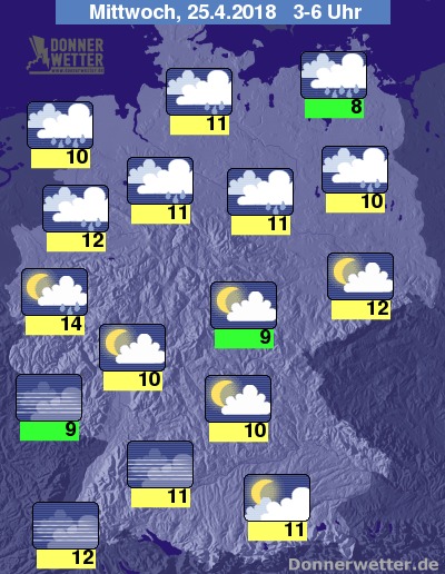 Am Mittwoch ist es im Süden verbreitet heiter oder sonnig und dazu trocken. Im übrigen Bundesgebiet ist es hingegen überwiegend stark bewölkt und es bilden sich zeitweise Schauer. Die Temperatur steigt auf frische 11 Grad in Aurich und bis 25 Grad in München.