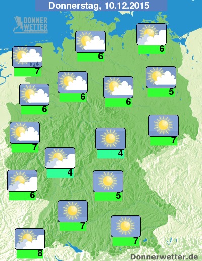Heute ist es vor allem im Süden, aber auch im Osten von Deutschland häufig sonnig und trocken. Im übrigen Bundesgebiet zieht meist lockere bis aufgelockerte Bewölkung durch, gegen Abend ziehen sich die Wolken im Nordwesten zu, dazu kann im nördlichen Emsland und im Nordseeumfeld auch Regen fallen, sonst bleibt es aber trocken. Die Temperatur steigt auf 4 Grad im Vogtland und bis 8 Grad im Breisgau.