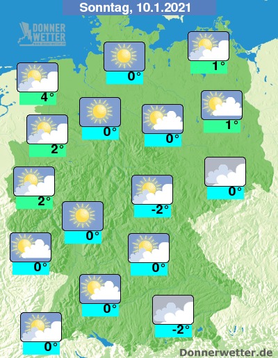 Am Sonntag bleibt es über dem Alpenvorland meist stark bewölkt und es fällt hier gebietsweise etwas Schnee, sonst ist es teils stark bewölkt oder neblig-trüb, oft heitert es aber auch auf, dabei bleibt es weitgehend trocken. Die Temperatur steigt auf -2 Grad in München und bis 4 Grad in Cuxhaven.