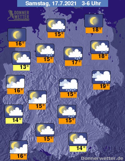 In der kommenden Nacht halten sich in einem breiten Streifen vom Saarland, Rheinland-Pfalz bis in den kompletten Osten Deutschlands dichte Wolken, dabei bilden sich hier gebietsweise Schauer. Nordwestlich und südöstlich des Bandes ist es überwiegend locker bis wechselnd bewölkt oder zum Teil auch sternenklar, dazu bleibt es weitgehend trocken. Die Temperatur sinkt auf 19 Grad in der Lausitz und bis 13 Grad im Münsterland.